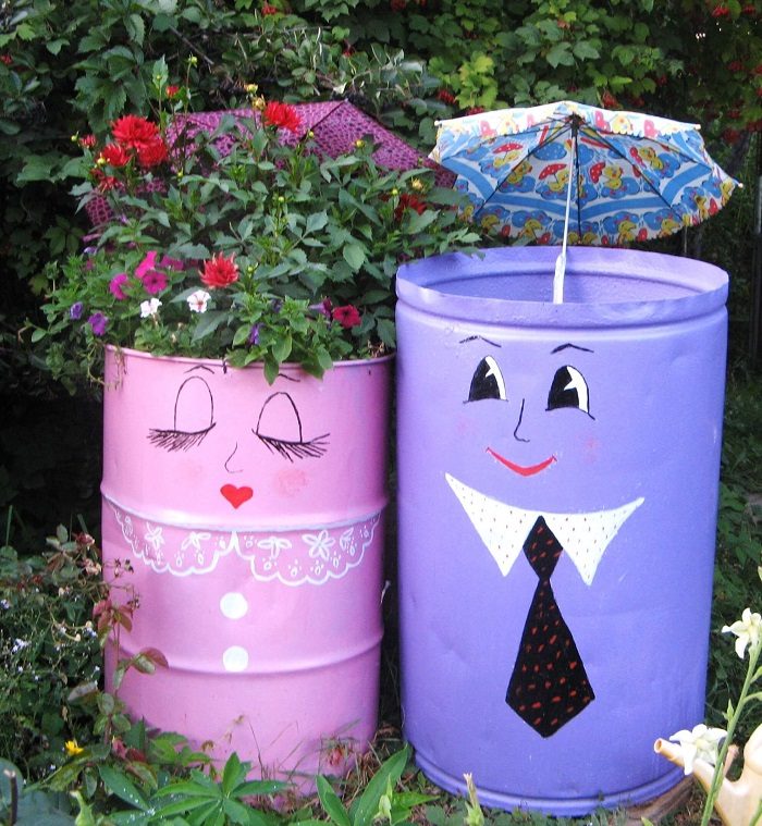 Вышедшую из употребления бочку не стоит выкидывать! Она идеально подойдет для создания цветочных композиций, главное — проявить фантазию.Можно распилить бочку пополам или вдоль, а в полученные части насыпать грунт. Даже если просто ее поставить и засадить яркими цветами, выглядеть она будет эффектно.