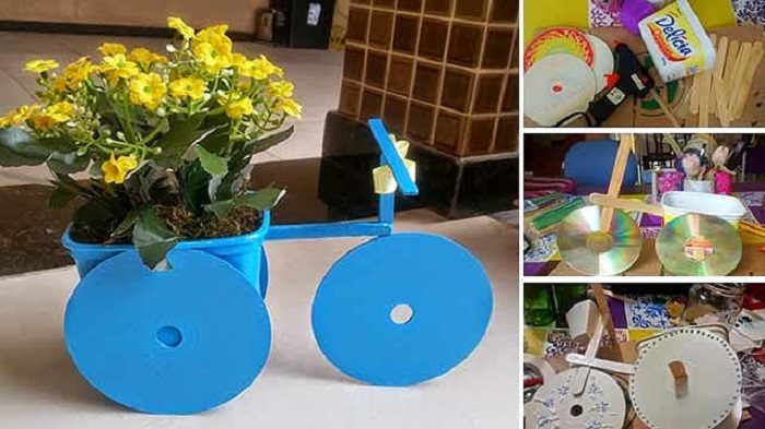 Отличный вариант не только для дачи, но и для дома. Пластиковый стаканчик и три старых компакт-диска — и у тебя готов миниатюрный вазон для рабочего стола или кухни.