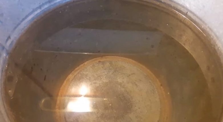 Как только ты почувствуешь, что нагар на твоей сковороде стал более мягким, а вода потемнела, можешь доставать сковороду. Но будь крайне аккуратен. Сковорода горячая, поэтому держи ее прихваткой или полотенцем. К очистке сковороды снаружи и внутри приступай при помощи скребка, ножа и алюминиевой губки.