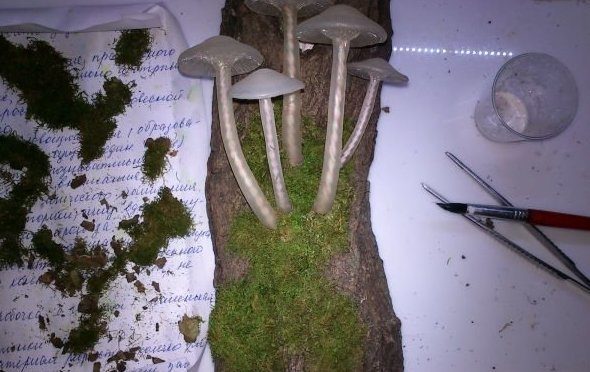 Толщина ножек — по желанию. Далее они с помощью фена и термоклея скрепляются со шляпками. Место их стыка должно схватиться. И лишь потом можно приступать к окончательному оформлению грибков: с помощью разогретого скальпеля на внутреннюю часть их шляпок наносятся аккуратные бороздки (они имитируют пластинки), а также сглаживается место склейки — убирается все лишнее, торчащее.