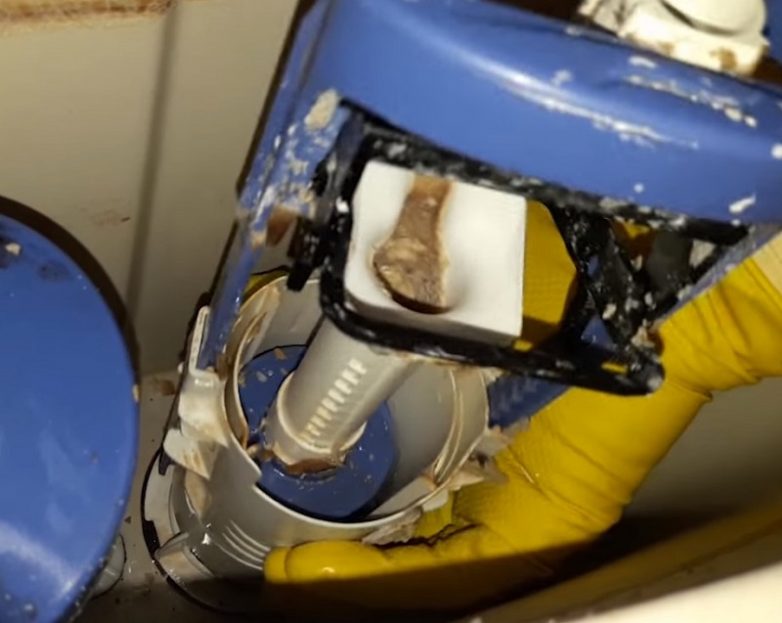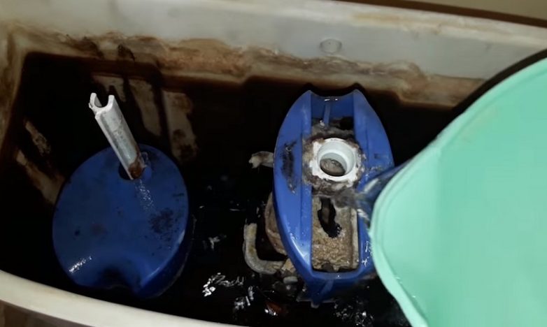 Когда всё очищено, спусти грязную воду и открой кран подачи воды, чтобы бачок вновь наполнился чистой водой. Если загрязнения не очень велики, этого должно хватить.Как видно на фото, идеального результата добиться не получилось. Больше всего загрязнений осталось на механизме спуска воды.