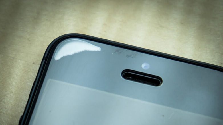 Не всегда удается приклеить стекло на телефон без попадания пыли и ворсинок. Если увидели, что под пленку попали соринки, отклейте стекло ровно до места, где есть грязь.