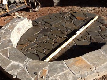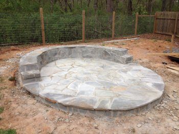 Настала очередь самого кострища. В данном случае оно просто выложено из стандартных каменных плит, без использования раствора. Менее затратным будет вариант с укладкой кострища из огнеупорного кирпича, но такой в общую стилистику не вписывался, и было принято решение в пользу более дорогого варианта.