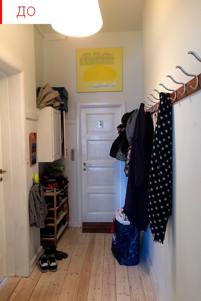 На фото типичная прихожая: узкая и заполненная вещами. Все эти вещи, действительно, удобнее хранить у входной двери, но можно сделать это по-другому.