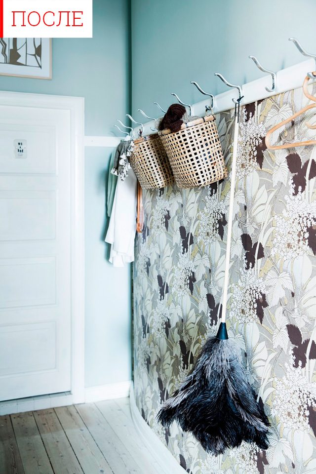 И, поскольку, все уже убрано в шкаф, вешалки можно использовать для мелочей. На них можно расположить подвесные корзины для шарфиков или собачьих поводков, вешать ключи и зонты или повесить небольшое зеркало. Важные детали — картина над входной дверью, на которую обращаешь внимание только при выходе из дома, ну и, конечно, очень стильный шарообразный светильник.