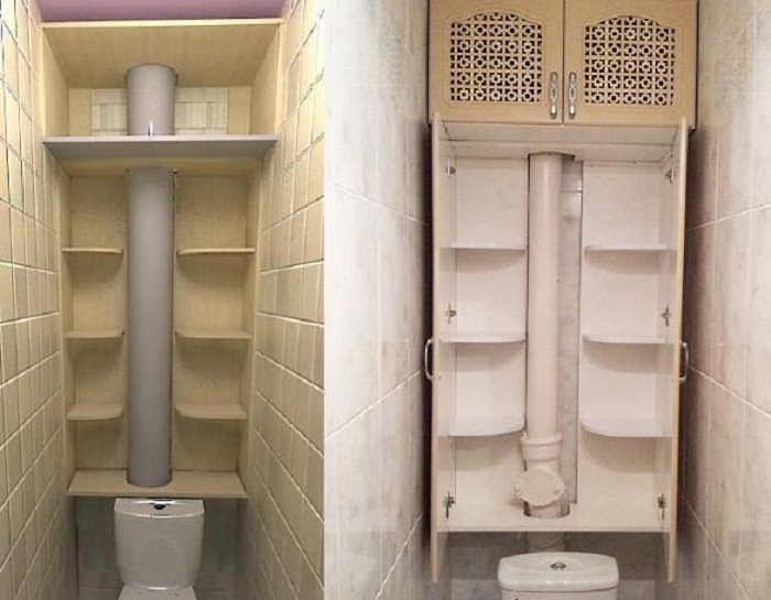 Еще один способ спрятать трубы в туалете — это маскировка с помощью мебели.Шкафчик с дверками, скрывающими коммуникации, и полки для хозяйственных нужд вешаются на стену за унитазом. Это обеспечивает свободный доступ ко всем коммуникациям.