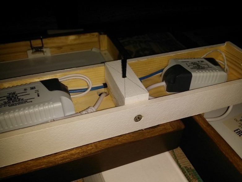 Приклеил все необходимые упоры и места крепления. Сделал длинный короб в который будут прятаться драйверы и провода. После обработал все наждачной бумагой и скруглил углы. Короба светильников покрыл морилкой, а короб драйверов белой краской. После покрыл матовым акриловым лаком.