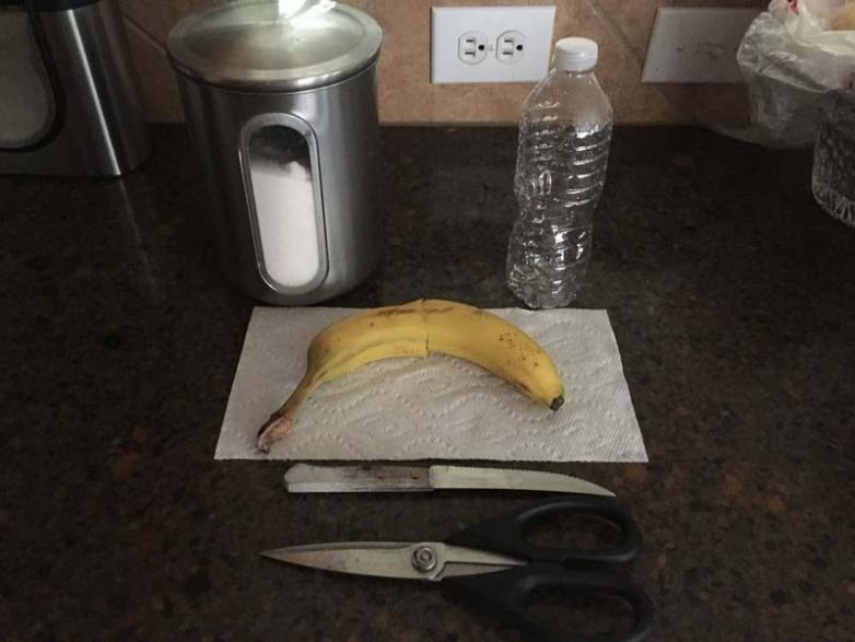 Итак, для сооружения ловушки нам понадобятся: пустая пластиковая бутылка, ножницы, нож, сахар, вода, банан
