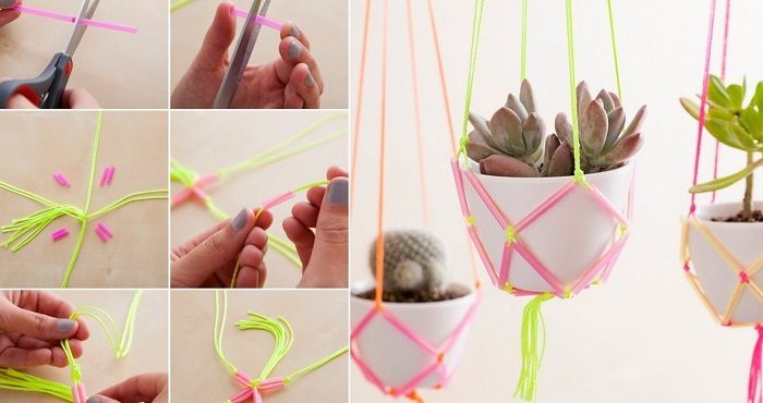 Подвесное кашпо из соломинок подойдет к интерьеру с инновационными нотками. Просто возьми пачку неоновых соломинок для коктейлей, крепкую нить и начни работу. Причем для этого тебе будет достаточно даже 15 минут!