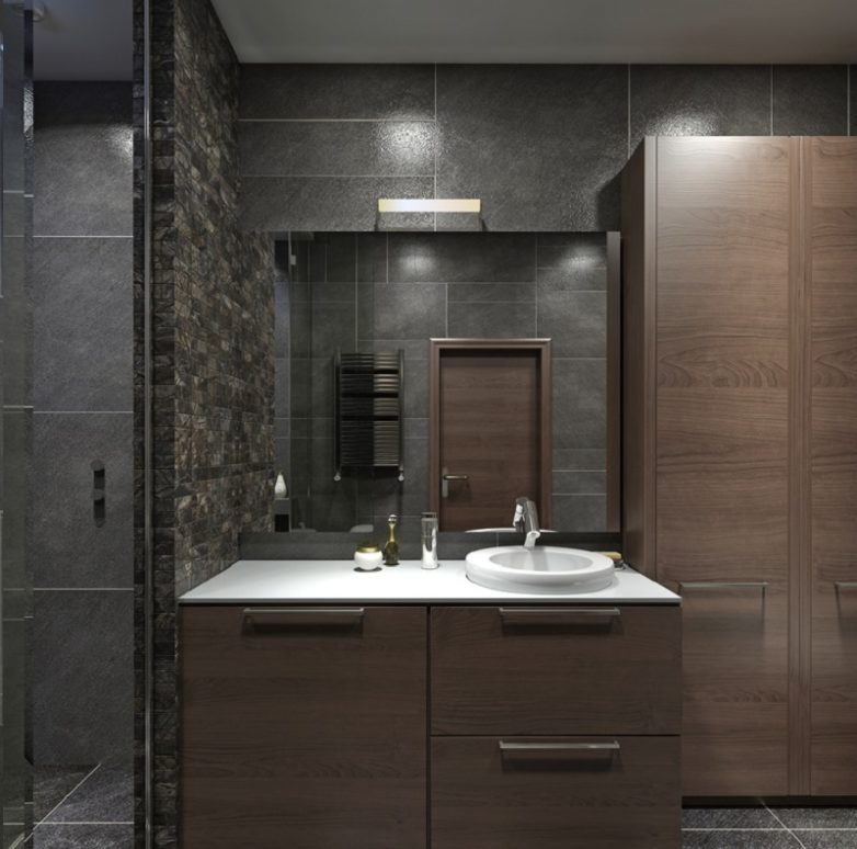 Темная глянцевая плитка смотрится очень необычно и эффектно, но, честно говоря, это не лучший вариант для ванной комнаты. Такая комната будет тебя утомлять, а утром ты не сможешь быстро проснуться. Темные комнаты еще и кажутся меньше.Верный способ увеличить пространство — использовать светлые оттенки. Белый цвет будет отражать свет и сделает помещение просторнее и уютнее.