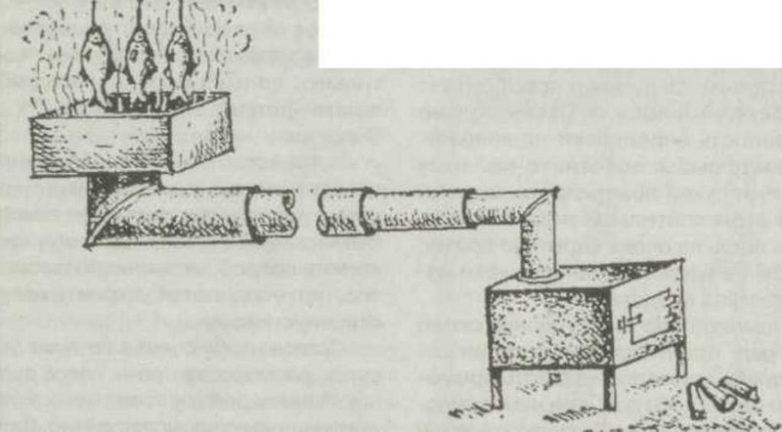 Наиболее часто встречались следующие коптильни. На металлическую буржуйку, у которой вырезана верхняя часть, устанавливали железную бочку на дно которой насыпали опилки и тальниковые дрова. Внутри бочки, ближе к верхнему торцу, натягивали проволочные струны для подвешивания (укладывания) полуфабрикатов.