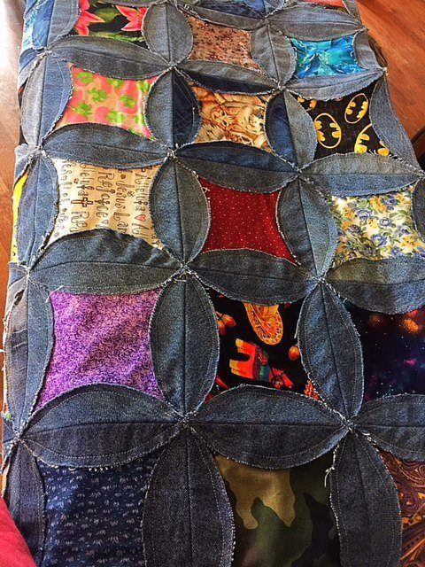 От автора: «У мужа было очень много старых джинсов, поэтому я решила сшить из них одеяло. Это одеяло я сшила своими руками, оно состоит из различных видов джинсов, мое творение можно назвать лоскутным одеялом, посмотрите, края изношены.»