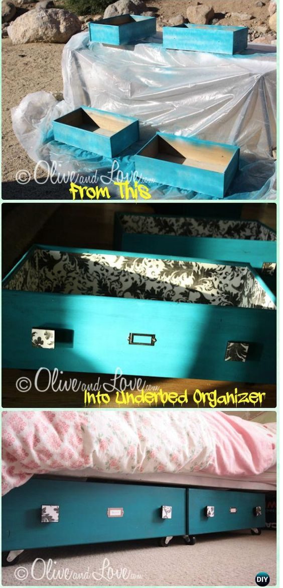 Изменить плоскостьВыдвижные ящики — это в любом случае очень удобно, но вовсе не обязательно располагать их вертикально. Дополните каждый колесиками и храните там, где есть свободное место.