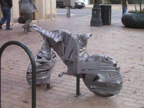 Ещё один, не к ночи будь помянут, лайфхак: ленту (скотч), которой обмотан велосипед, угонщику совершенно необязательно разматывать — её намного проще и быстрее СРЕЗАТЬ обычным канцелярским («строительным») ножом за 40 р. При наличии определенного опыта вполне достаточно только сменного лезвия от этого ножа — это еще проще и дешевле…
