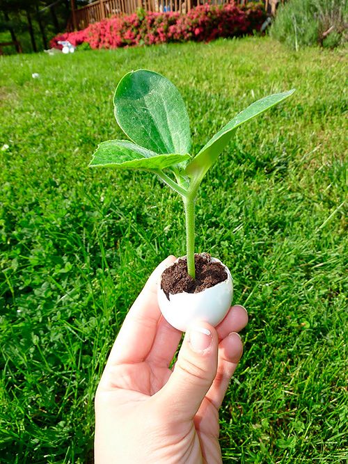 Для этого нужно взять целую яичную скорлупу (такая получается, если яйцо выпить сырым или приготовить в смятку и аккуратно выскрести ложечкой), сделать отверстия для дренажа, насыпать в нее плодородной земли и высадить зерно. Когда рассада «созреет», высаживать в грунт ее можно вместе со скорлупкой.