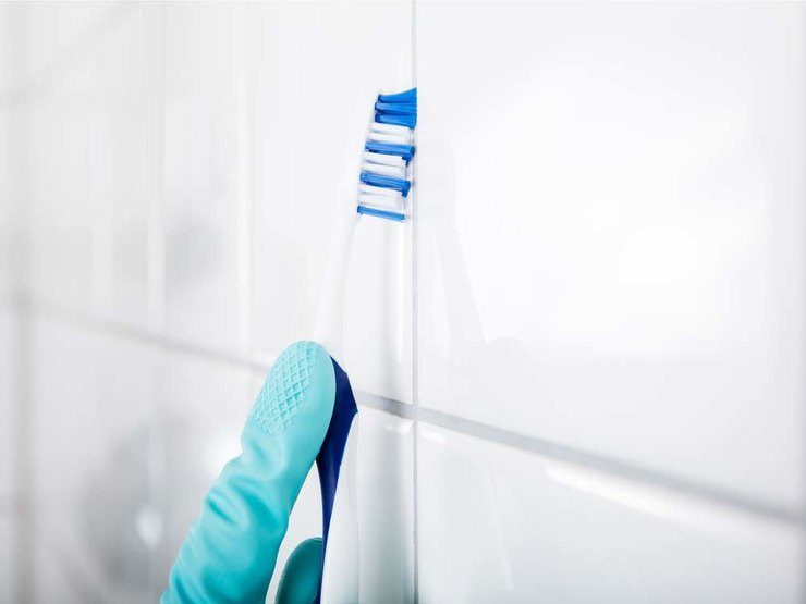 С помощью зубной щетки можно легко и быстро освежить вид затирки в швах между плитками в ванной и туалете. Обмакните щетку в раствор хлорки и потрите ей загрязненные места. После окончания уборки промойте плитку чистой водой.