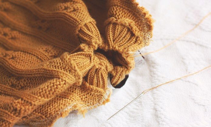 свитер мелкой вязки; нитки; ножницы; швейная машинка; бусины или другой декор.