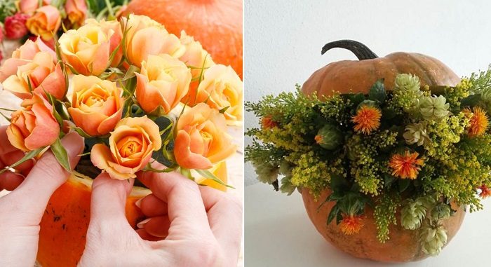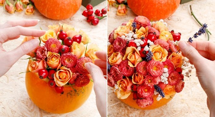 А теперь самое приятное и творческое — размещение цветов в тыкве. Тут всё зависит от того, какими материалами ты располагаешь.Это может быть просто букет однотонных цветов, например, красиво будет смотреться и композиция из маленьких оранжевых или бежевых роз, и композиция из пестрых осенних цветов и природных материалов в виде ягодок, каштанов, желудей и опавших кленовых листьев.