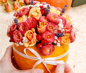 Такая цветочная композиция в тыкве послужит прекрасным украшением стола для праздничной осенней сервировки или станет незаменимым атрибутом тематического декора к Хеллоуину. Дополнить ее можно вырезанной тыквой «фонарь Джека», свечами и желтыми листьями, собранными в парке.