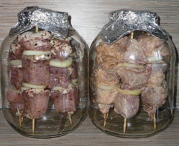 Все видно, да? Маринуем мясо, нанизываем на шпажки, ставим в духовку (вниз банки можно покидать лучок, который мариновался вместе с мясом, чуть водички и специи)