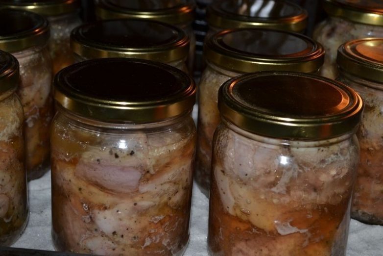Мясо (любое — свинина, говядина, курятина) режется кусочками и укладывается в банки (можно с овощами, они, правда, увариваются сильно, но можно добавить в процессе). Совет — не докладывайте мясо до верха, сок будет вытекать. И в печь их, печь, точнее томиться...