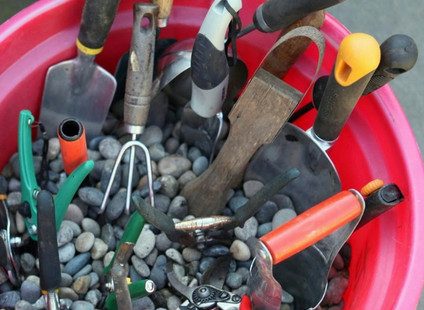 Наполните ящик крупным песком или мелкой галькой. Лезвия будут острыми, чистыми и не пострадают от ржавчины.