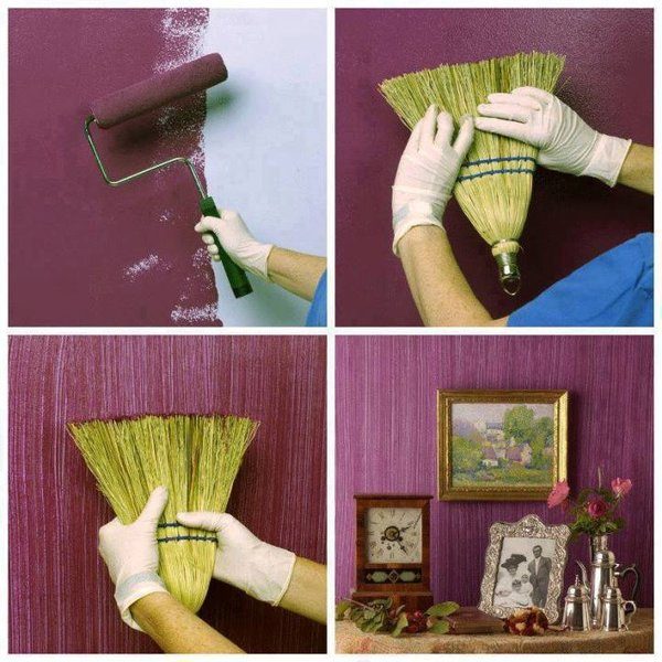 Для создания вертикальных чуть заметных полос можно использовать обычный веник.