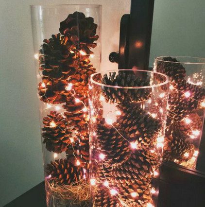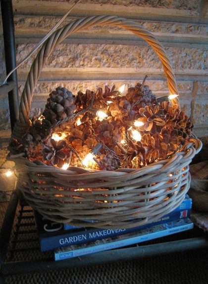 Приятно пахнущие шишки можно сложить в вазу или корзину и сделать небольшой светильник, добавив светодиодную ленту или поместив свечу в стеклянном подсвечнике.