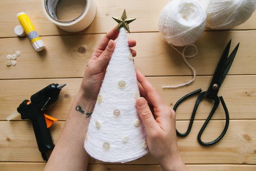 Незатейливая мини-елочка поможет украсить рабочий стол или подоконник. Сверни из плотной бумаги конус, аккуратно отрежь лишний материал снизу и нанеси тонкий слой клея ПВА. Начинай обматывать конус пряжей от верхушки к нижней части, плотно прижимая каждый новый слой ниток, а под занавес укрась елочку цветными пуговицами.