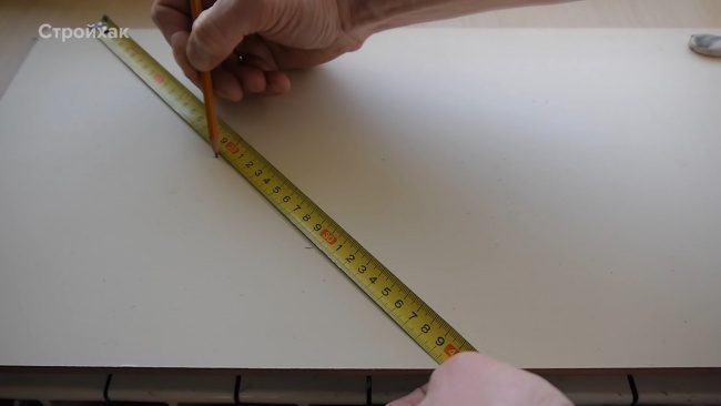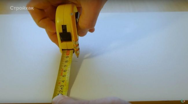 Для отметки лучше ставить не черточки, а галочки, — с помощью них получается более точный результат. Сделав два измерения, складываем числа: получаем необходимую длину.