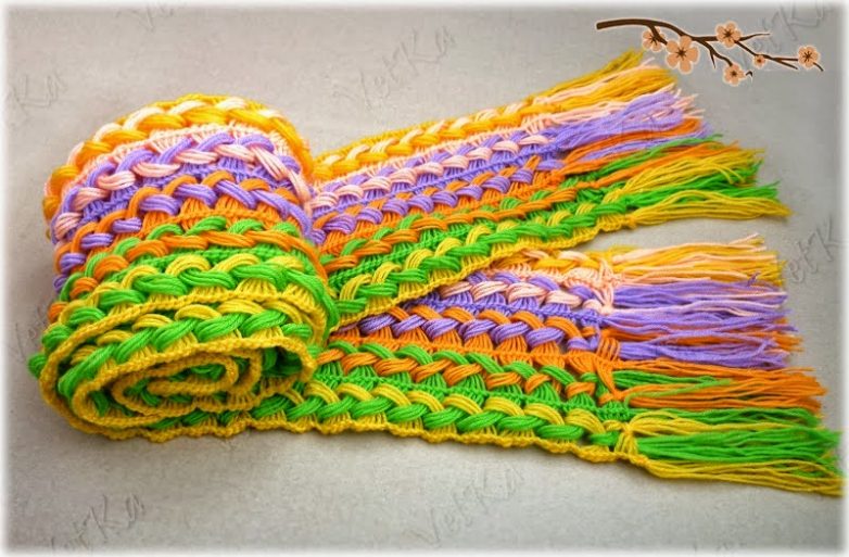 Подготавливаем еще одну длинную полосу с петлями и присоединяем к основному полотну. Работу продолжаем до тех пор, пока ширина шарфа не будет достаточной. В конце добавляем бахрому. Готовый шарф смачиваем водой и даем ему высохнуть в расправленном состоянии.