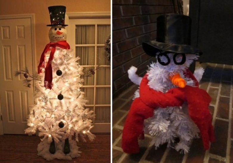 Белая елка, дополненная несколькими деталями, превращается в добродушного снеговика. Бывают и менее удачные перевоплощения…