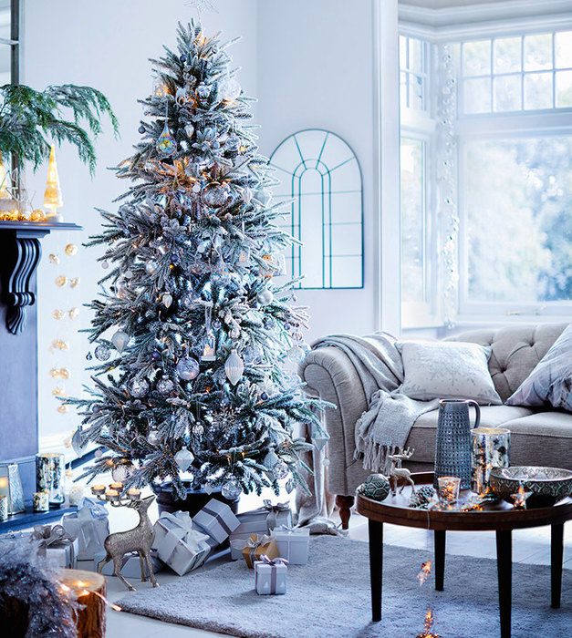 Если основной цвет стен белый, выбирайте игрушки и предметы декора в серебре и ледяной белизне. Елка в «инее» поддержит образ ледяных чертогов.