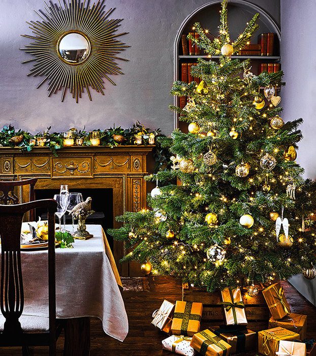Золотистая упаковочная бумага, шары и гирлянды из лампочек с теплым желтоватым светом создают роскошный образ новогодней сказки. Не забудьте про декор стола в той же гамме!