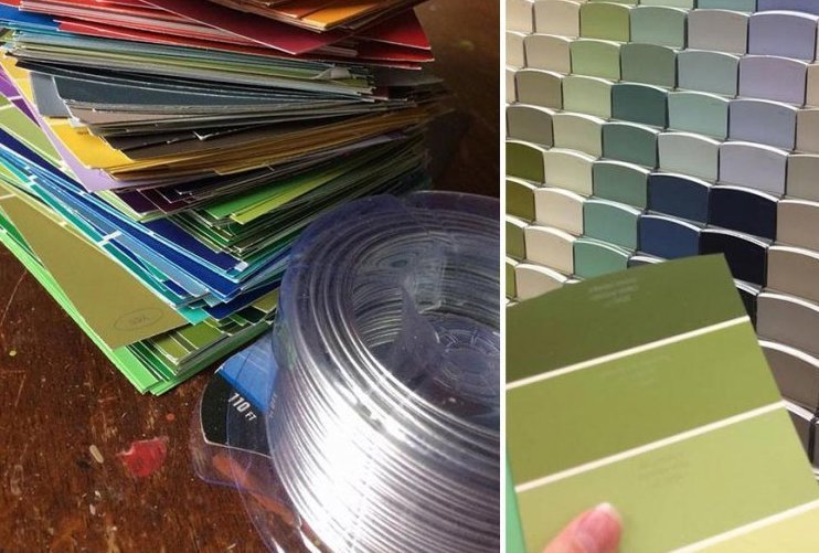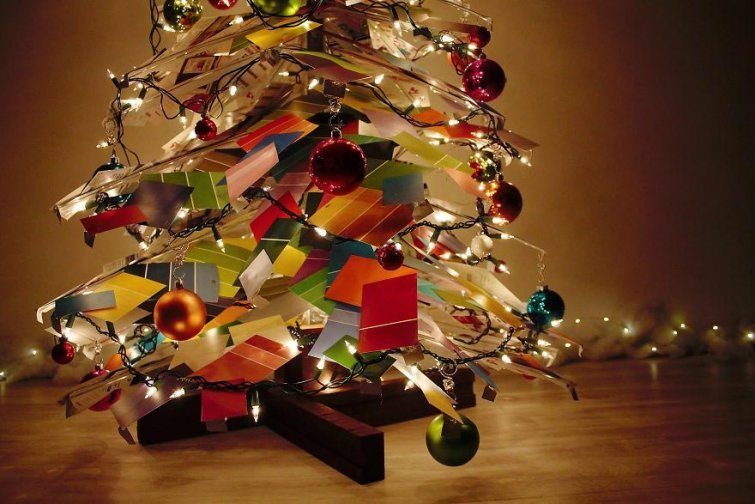 В этом году пара купила новый дом, после чего естественно приступили к его ремонту. После 6 месяцев бесконечных поездок в строительные и прочие магазины для благоустройства, у них накопилась огромная гора из карточек с образцами красок разных оттенков. Чтобы не выкидывать это цветастое добро зря, пара решила сделать из образцов краски самую неожиданную вещь — рождественскую ёлку.