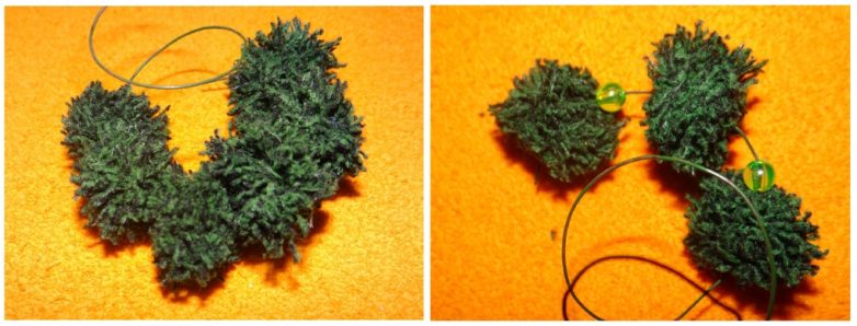 4. Начните нанизывать помпоны на проволоку, чередуя их с бусинами; край проволоки загните кольцом или обмотайте вокруг бусины.