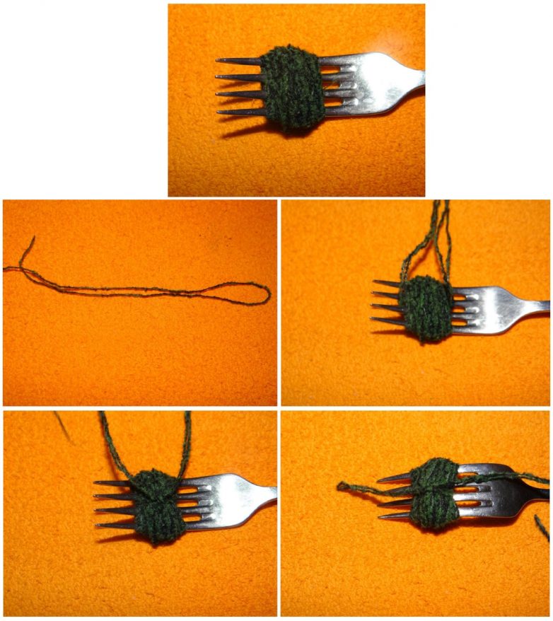 2. С помощью вилки накрутите из пряжи помпоны. Для этого обмотайте пряжей зубцы вилки, а затем протяните отдельный кусочек нити между средними зубцами и плотно завяжите на два узла (их лучше сделать с разных сторон). Завязывайте крепко, иначе помпоны начнут разваливаться.