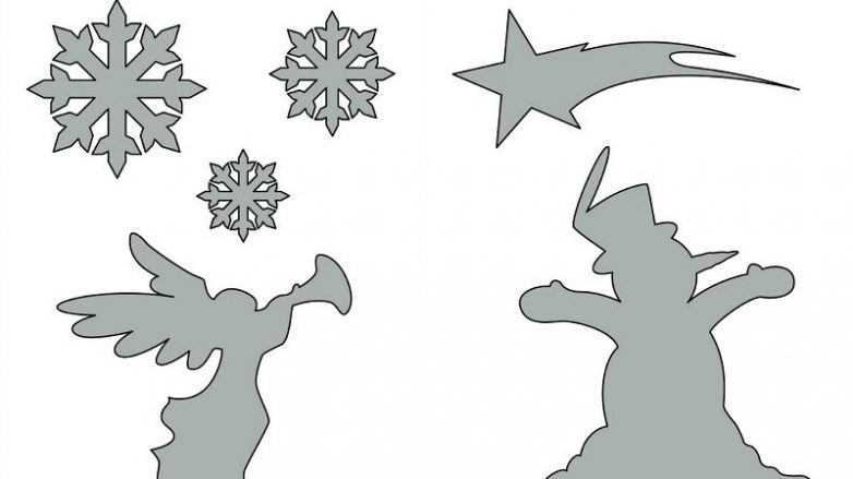 2. Заранее подготовленные трафареты из бумаги смочите в воде, чтобы прикрепить к окнам. Если с них течёт вода, аккуратно промокните их на окне сухой тряпкой.