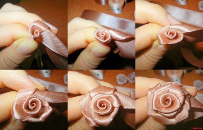Чуть ниже вы найдёте подробные пошаговые мастер-классы по созданию очаровательных цветов из атласных лент. Различаются эти способы сворачиванием кусочков лент: