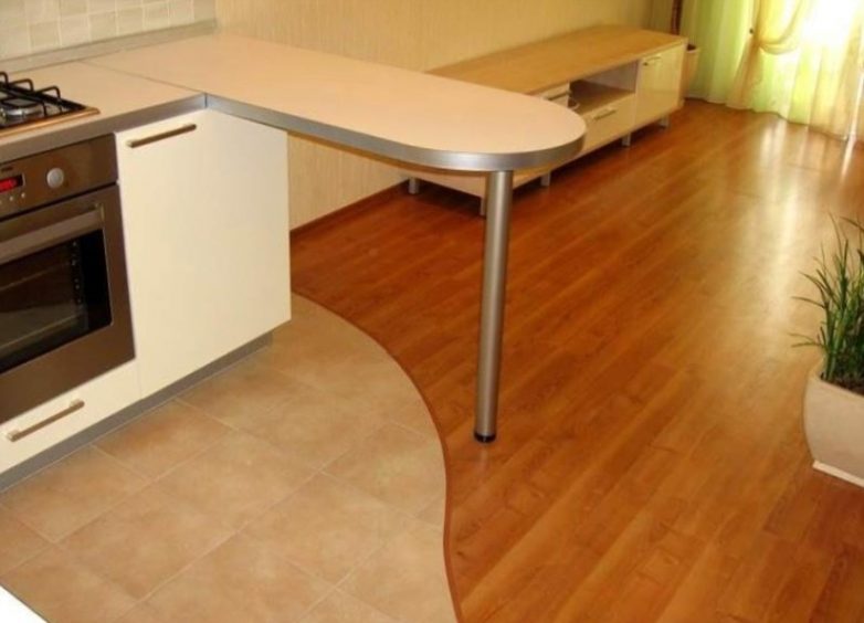 • Выбор напольного покрытия для кухни — задача не из легких. Не забывайте, что в случае форс мажора на пол может упасть все, что угодно, даже кастрюля. Именно поэтому дерево и ламинат для всей кухни не подходят.