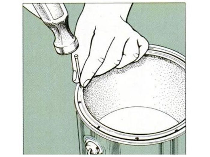 Чтобы навсегда избавиться от засохшей по краям банки краски, возьмите гвоздь и молоток и сделайте отверстия по ободу.