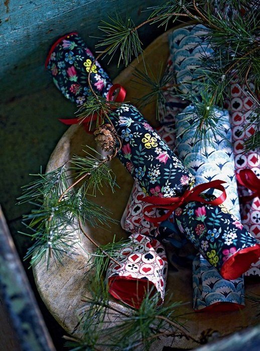 Возьмите цветные бумажные салфетки и упаковочную бумагу и вырежите под размер листа А4. Преимущество самодельных хлопушек в том, что вы можете выбрать оберточную бумагу, которая больше всего подойдет к вашей сервировке и станет дополнительным элементом праздничного декора.