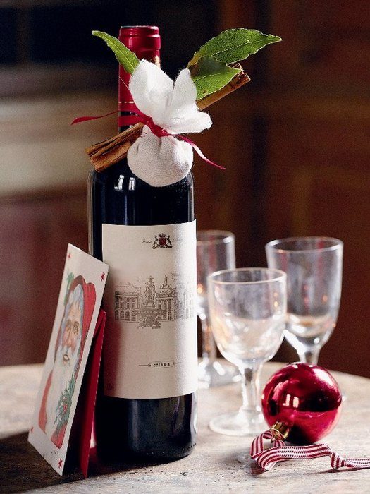 Соедините уголки марли, чтобы получился мешочек, и перевяжите бечевкой. Прикрепите к бутылке вместе с мешочком палочку корицы и свежий лавровый лист. Так вино превратится из банальной бутылки в оригинальный и приятный подарок.