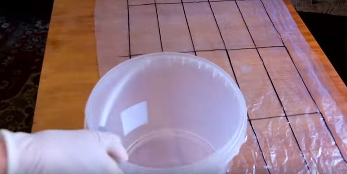 Сделай разметку на куске полиэтиленовой пленки. При помощи линейки и черного маркера разметь на пленке деления для будущих кирпичиков. Размер одного прямоугольника 7 х 20 сантиметров.