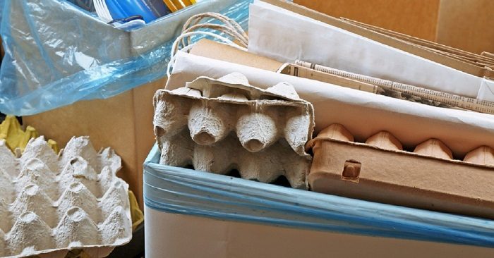 Измельчи 3 картонных лотка в удобную емкость (у меня было небольшое пластиковое ведерко) и залей картон водой. Оставь настаиваться в течение 2 часов.