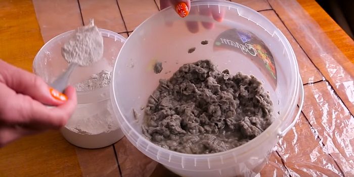 Когда масса полностью размокнет и набухнет, добавь в ведро гипс и тщательно всё перемешай.