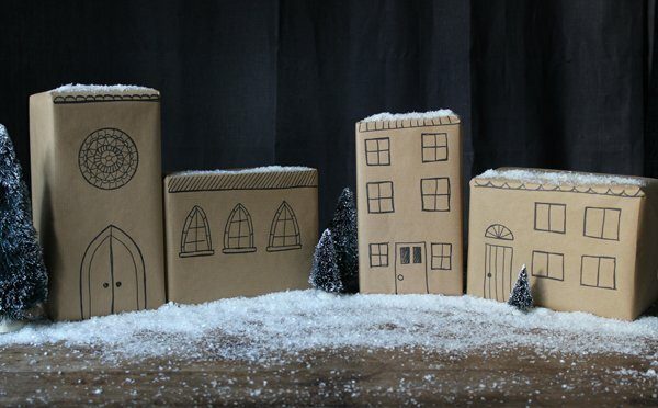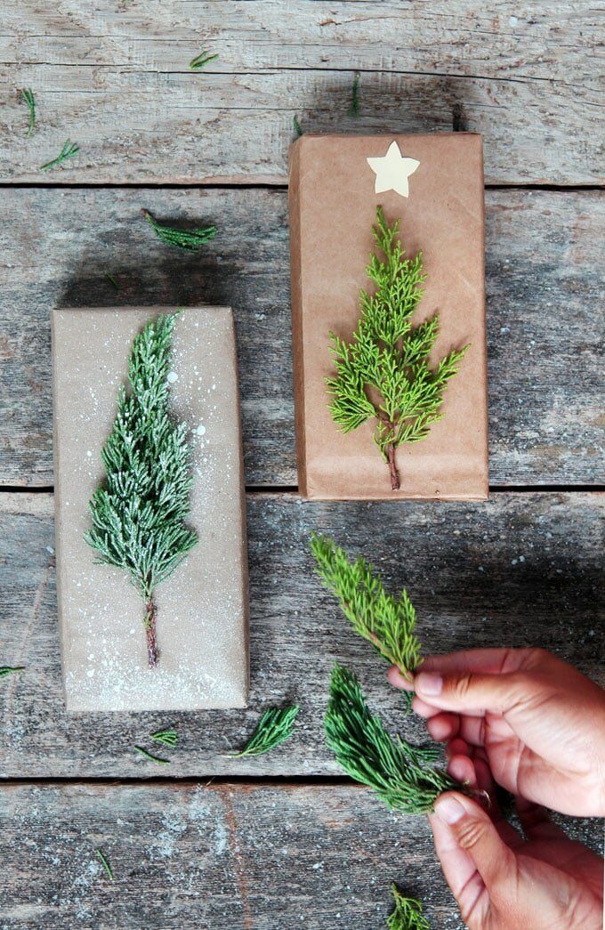 Из газеты можно наклеить буквы на упаковку. А штампами в виде ёлок разукрасить бумагу.