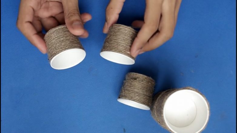 Необычная композиция из одноразовых стаканчиков и джутового шпагата