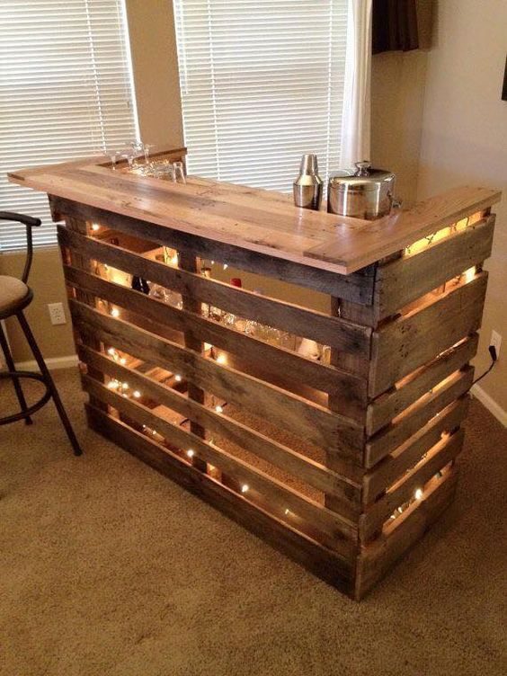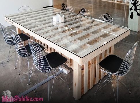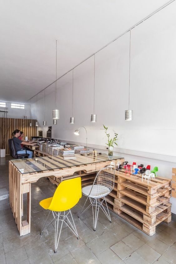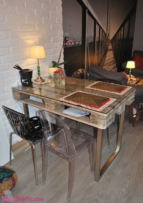Из поддонов получаются любопытные полочки и даже столы! Дополненный столешницей, такой стол выглядит интересно и очень необычно!