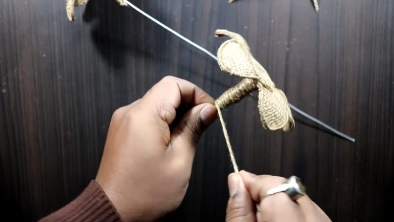 6. Отрезаем кусочек проволоки, прикрепляем к цветку, оборачиваем джутовым шпагатом, приклеиваем в конце.